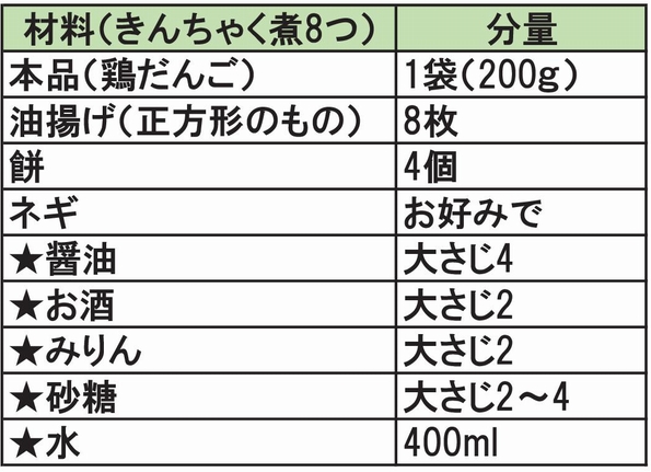 - 油揚げに切り込みを入れ、凍ったままの鶏だんごと半分に切った餅を詰めたら、爪楊枝で口を縫うように止めます。(餅を入れない場合は、鶏だんご2個でもOK)